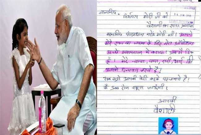 प्रधानमंत्री ने कहा, 'वैशाली ने अपने ऑपरेशन के बाद मुझे एक भावुक पत्र लिखा जो मुझे हमेशा याद रहेगा। इस बच्ची की मदद कर सका, इसको लेकर खुशी है।'