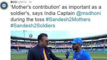 टॉस के दौरान इस बारे में पूछे जाने पर धोनी ने कहा, "हम पिता का सरनेम रखने के आदी हैं. जरूरी है कि मां जो योगदान करती है हम उसका भी सम्मान करें."