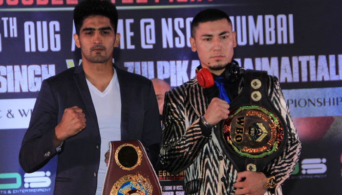 विजेंदर डब्ल्यूबीओ एशिया पैसिफिक मिडिलवेट चैम्पियन हैं और वह वर्ली में एनएससीआई स्टेडियम में डब्ल्यूबीओ ओरिएंटल सुपर मिडिलवेट चैम्पियन जुल्फिकार के आमने सामने होंगे, मंगलवार (27 जून) को मीडिया कॉन्फ्रेंस में इसकी घोषणा की गयी जिसमें यह भारतीय स्टार भी मौजूद थे.