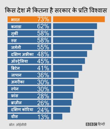 आर्थिक सहयोग एवं विकास संगठन (ओईसीडी) की ताज़ा रिपोर्ट में जहां एक ओर दुनिया भर देशों की सरकारों में जनता के विश्वास में व्यापक रूप से उतार चढ़ाव देखा गया वहीं अपने देश की सरकार में लोगों के विश्वास के मामले में भारत सबसे ऊपर है.